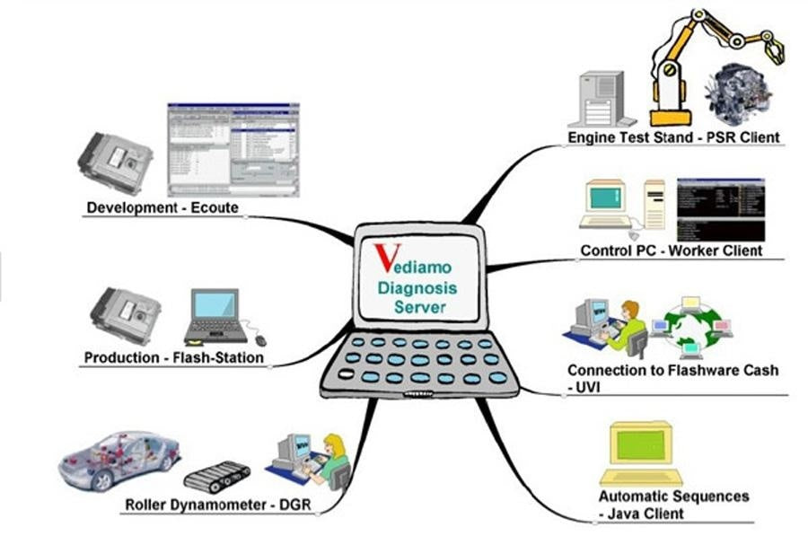 3. The architecture of the system allows it to be expanded easily by additional functionalities and even complete applications. This is done primarily using Java programs, for which Vediamo possesses a simple yet comprehensive connection, encompassing all ECU functions. Even users with limited programming skills in the standard language Java can develop their own applications. Generally applicable functions can subsequently be integrated in the clients by the Vediamo developers (e.g., graphic measurement display or the quick test) or be developed as new DCOM clients.