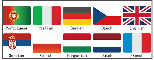 English, Cesky, Bulgarian,Dansk, Deutsch, Espanol, Francais, Greek,Hrvatski,Hollands, Hungarian, Italiano, Norsk, Polish, Romania, Russian, Srpski, Suomen kieli, Svenska, Turkish, Portugues.